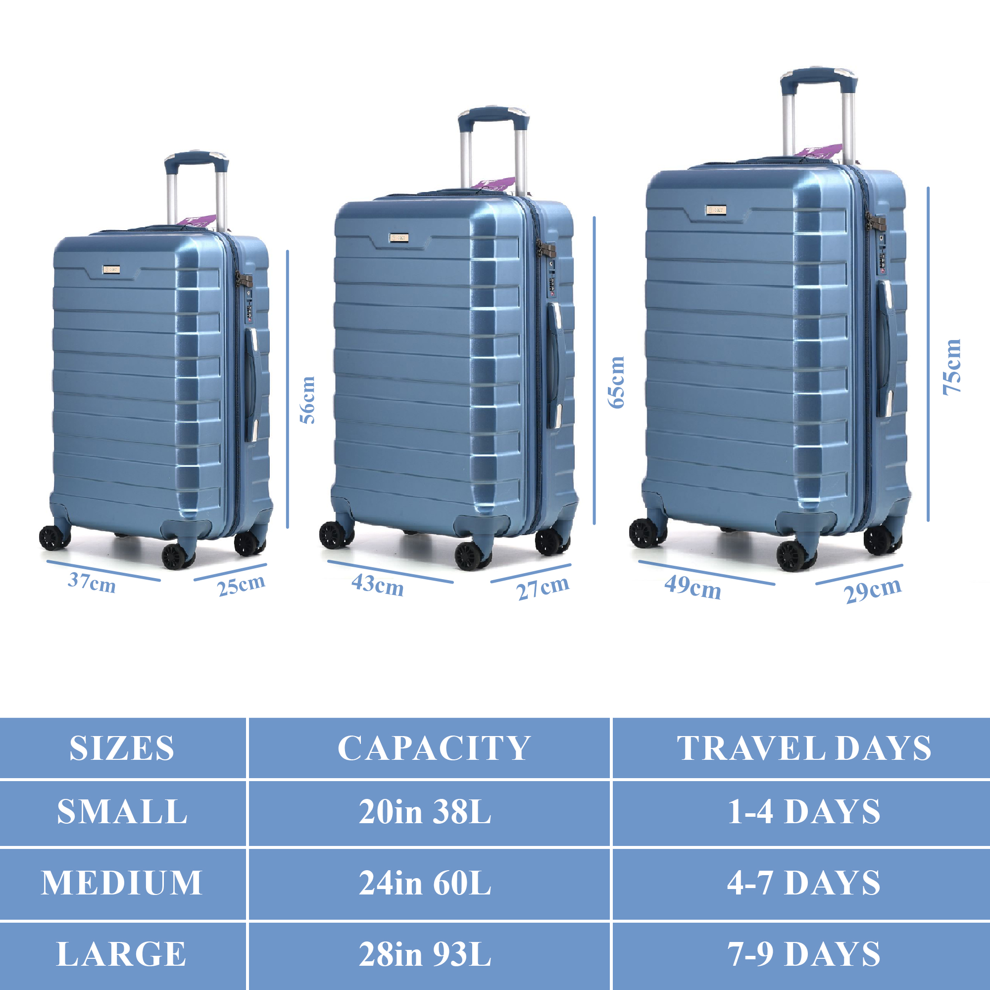 Size: Cabin + Medium + Large Suitcase