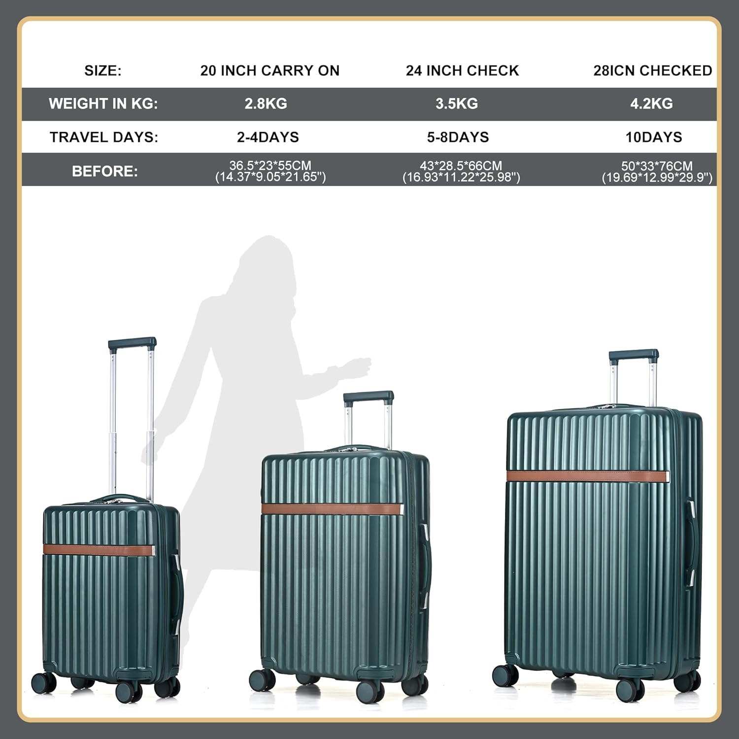 3-Piece Luggage Set for All Your Travel Needs – This set includes three suitcases: a 20-inch carry-on, a 24-inch medium checked bag, and a 28-inch large checked bag, providing flexibility for short trips, extended vacations, and family travels.